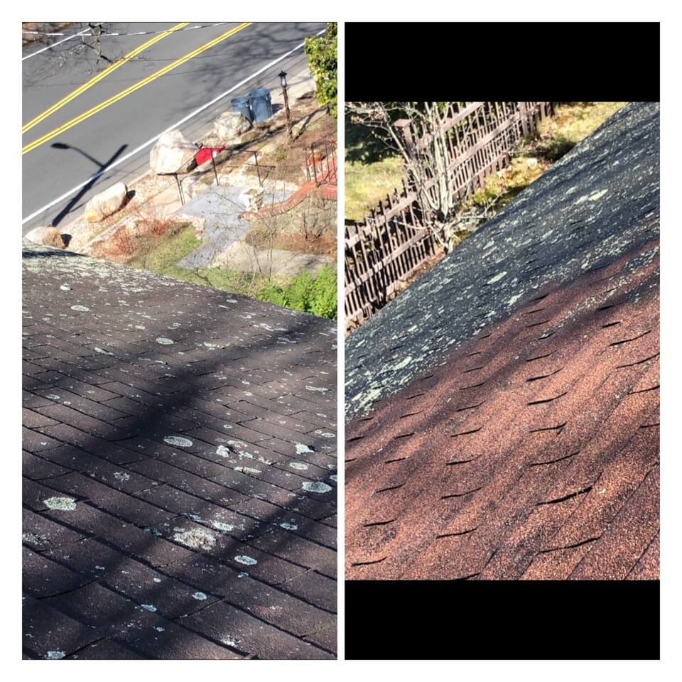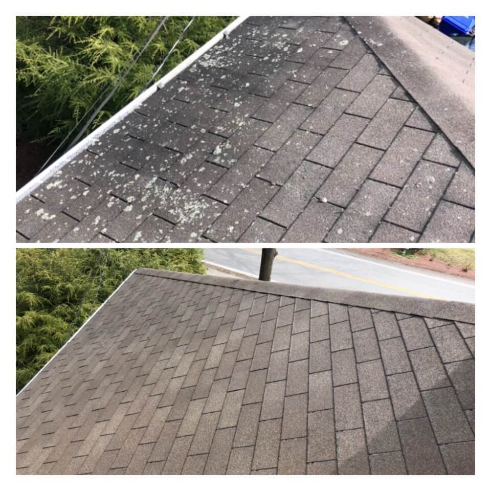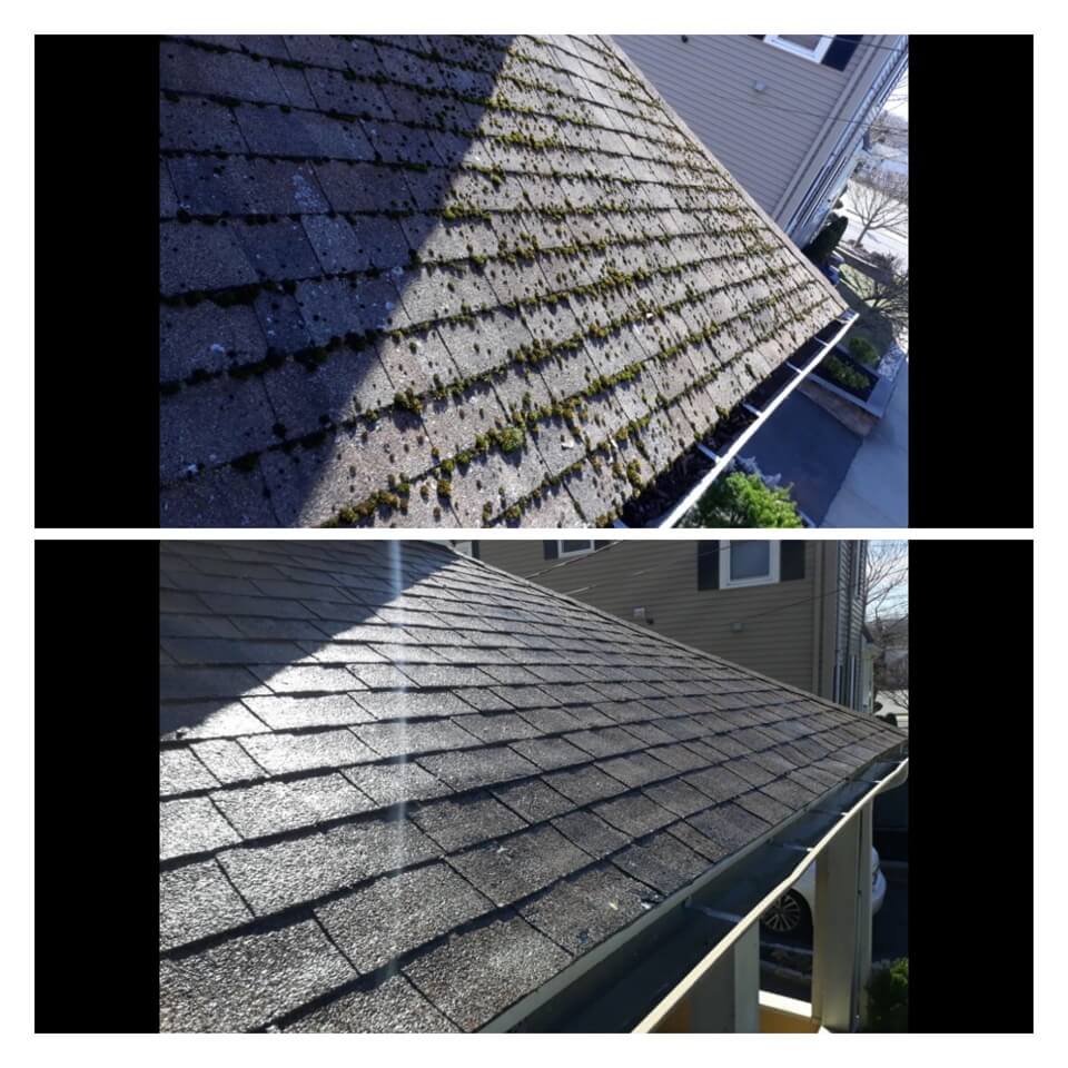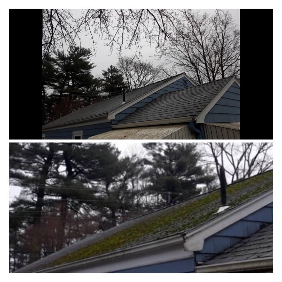 HiCleaners is the most experienced company in Middleton, MA that deals with roof washing and roof soft washing. All of our employees are trained to recognize precise solution mixing ratios to provide you with the safest and most effective soft washing service. Roofs are a commonly neglected part of a house due to the fact that most people don’t have ladders to access it, so it is very easy to just leave it alone and forget about problems that may start to arise. Just like many home owners, discoloration and small bits of moss on a roof can be overlooked because of the misconception that it is just aesthetic. However, it isn’t just aesthetic, the moss slowly lifts the granules off the shingles which in turn shorten the life of the shingle. The moss also spreads, just like any bacteria if it is left alone for too long, it can quickly become a problem that spirals out of control. Call HiCleaners for a free quote, we only use the most advanced eco-friendly solutions and equipment to make sure the job is done right, for the safety of the employees, your plants, grass, pets, and children.